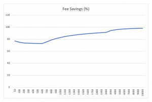 The fee difference is huge. For a $1000 charge, business owners can save $24. For $5k charge, the savings is $140. The saving is $285 for $10k charge. Here is another chart on the fee savings percentage.